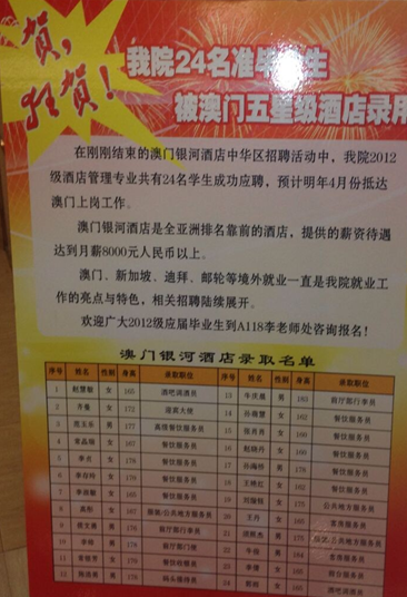 在刚刚结束的澳门银河酒店中华区招聘活动中,我院2012级酒店管理专业共有24名学生被录取,录取率高达70%,创近几年我院境外就业项目录取率新高,更是此次银河酒店中国北方区面试的录取冠军,在参加应聘的同类职业院校中名列第一。