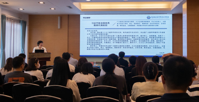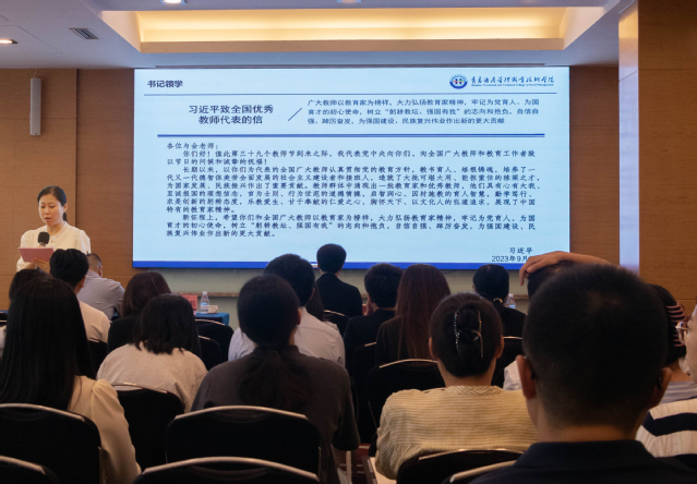 本网讯(酒店管理学院 孙晓宇)9月26日,酒店管理学院党总支在实训中心多功能厅开展教职工党员政治理论学习,此次学习以“躬耕教坛,强国有我”为主题,以习近平总书记全国教师节致信精神为主要学习内容,由酒店管理学院党总支书记徐莉领学,党总支全体党员参与学习。