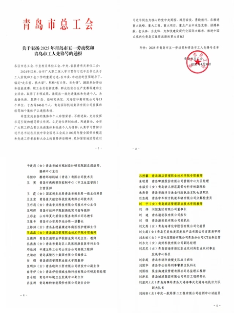 本网讯(酒店管理学院)近日,青岛市总工会发布了《关于表扬2025年青岛市五一劳动奖和青岛市工人先锋号的通报》,表彰了一批表现突出的先进集体和先进个人。我院教师王磊磊、吕照馨、刘宁3位教师荣获“青岛市五一劳动奖章”。