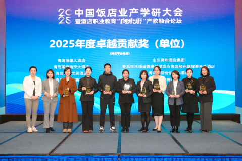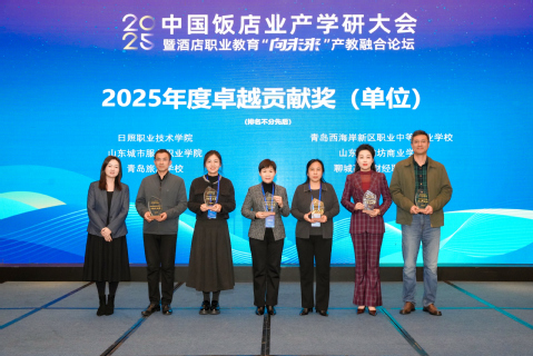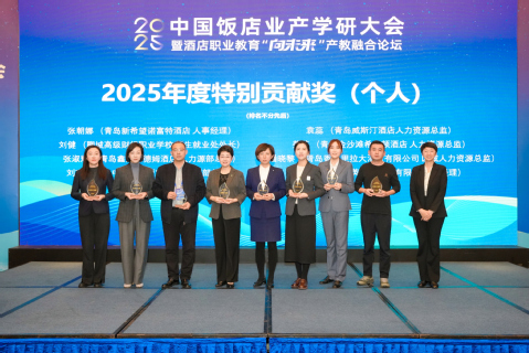 大会现场颁发了“2025年度卓越贡献奖(单位)”与“2025年度特别贡献奖(个人)”。山东城市服务职业学院、日照职业技术学院、青岛旅游学校等多所院校,以及青岛金水皇冠假日酒店综合体、山东舜和酒店集团、青岛国信海天大酒店等多家行业标杆企业荣获单位奖项。潘晓黎、袁蕊、刘健等来自酒店与院校的8位优秀代表获评个人特别贡献奖。
