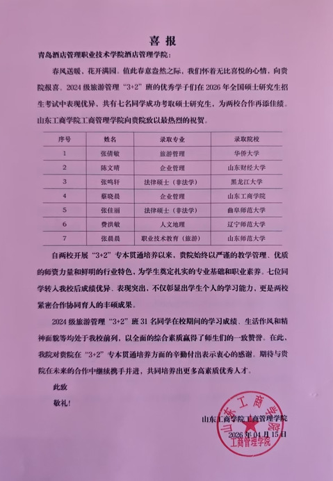 本网讯(酒店管理学院)4月15日,山东工商学院工商管理学院向酒店管理学院发来喜报,热烈祝贺我校2021级酒店管理与数字化运营专业专本贯通班在2026年全国硕士研究生招生考试中斩获佳绩——全班31名学生中有7人顺利考取硕士研究生,上线率达22.6%,录取率稳居山东工商学院旅游管理专业毕业班前列。